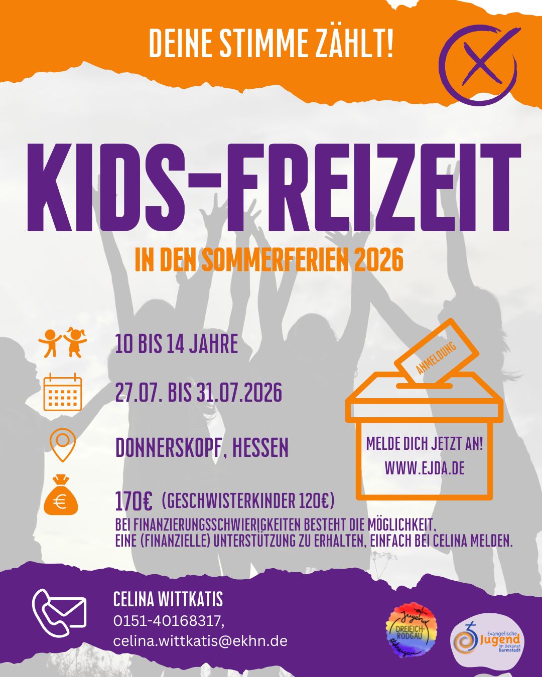 Wir fahren von Montag, den 27.07.2026 bis Freitag, den 31.07.2026 in Kooperation mit dem Dekanat Dreieich-Rodgau gemeinsam auf Kids-Freizeit. Es geht zum Donnerskopf, wo wir ein Selbstversorger-Haus gemietet haben und euch erwarten fünf spannende Tage.