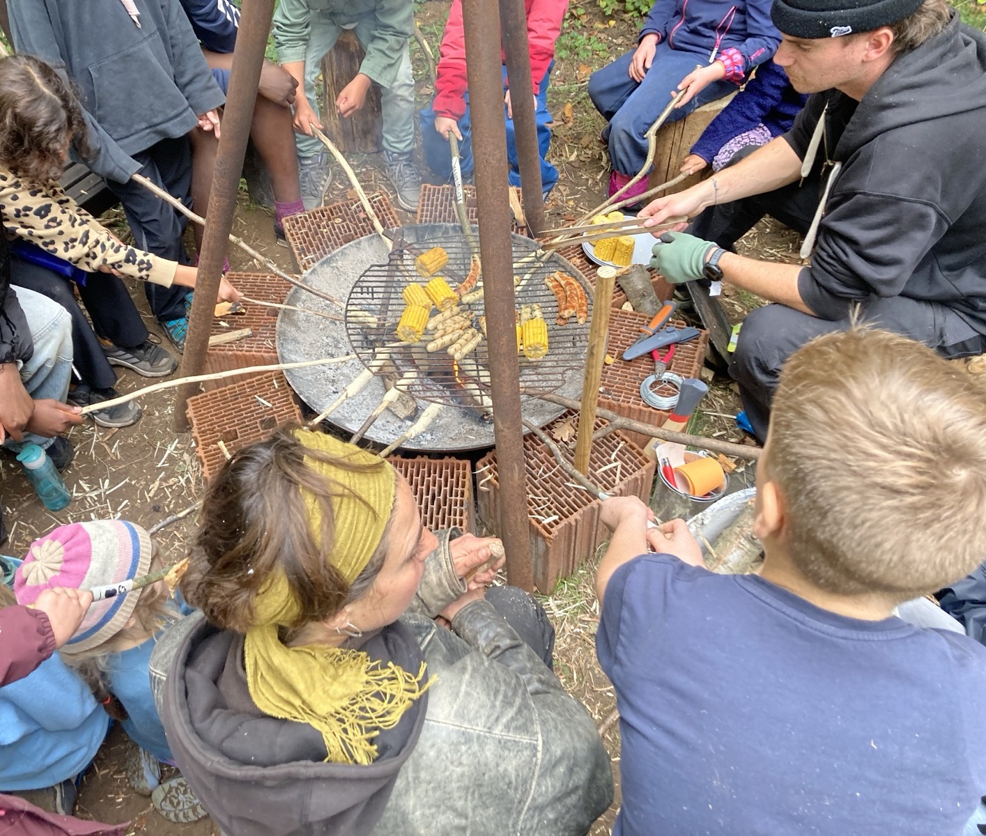 Das Frühstück wird zusammen draußen zwischen Haselsträuchern und Bambus eingenommen. Aus gesammelten Kräutern wird Kräuterbutter mit selbst geschüttelter Butter hergestellt. Anschließend wird das nahe gelegene Gelände erkundet und es bleibt Zeit der Natur zu begegnen, Tiere zu beobachten und den Blättern im Wind zu lauschen. Wir bieten Bogenschießen an und schnitzen unsere eigenen Löffel, Malen mit und in der Natur, basteln mit Bambus und lauschen dem knisternden Feuer. Wer mag hilft beim Feuer entfachen und Kochen für das Mittagessen.