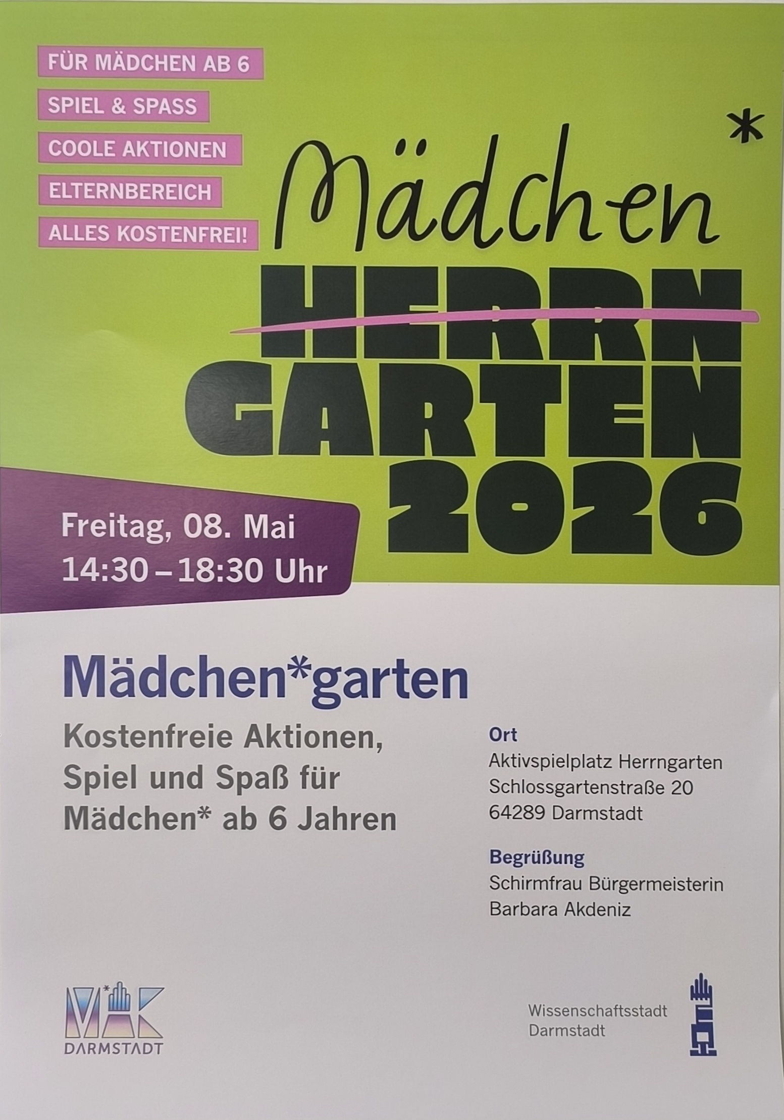 Für die Eltern und die kleineren Geschwister unter 6 Jahren, steht ein extra Wartebereich zur Verfügung, in dem sie sich ausruhen können und auf ihre Mädels warten können. Wir der MA*K Darmstadt freut sich auf euer zahlreiches kommen und mitmachen!